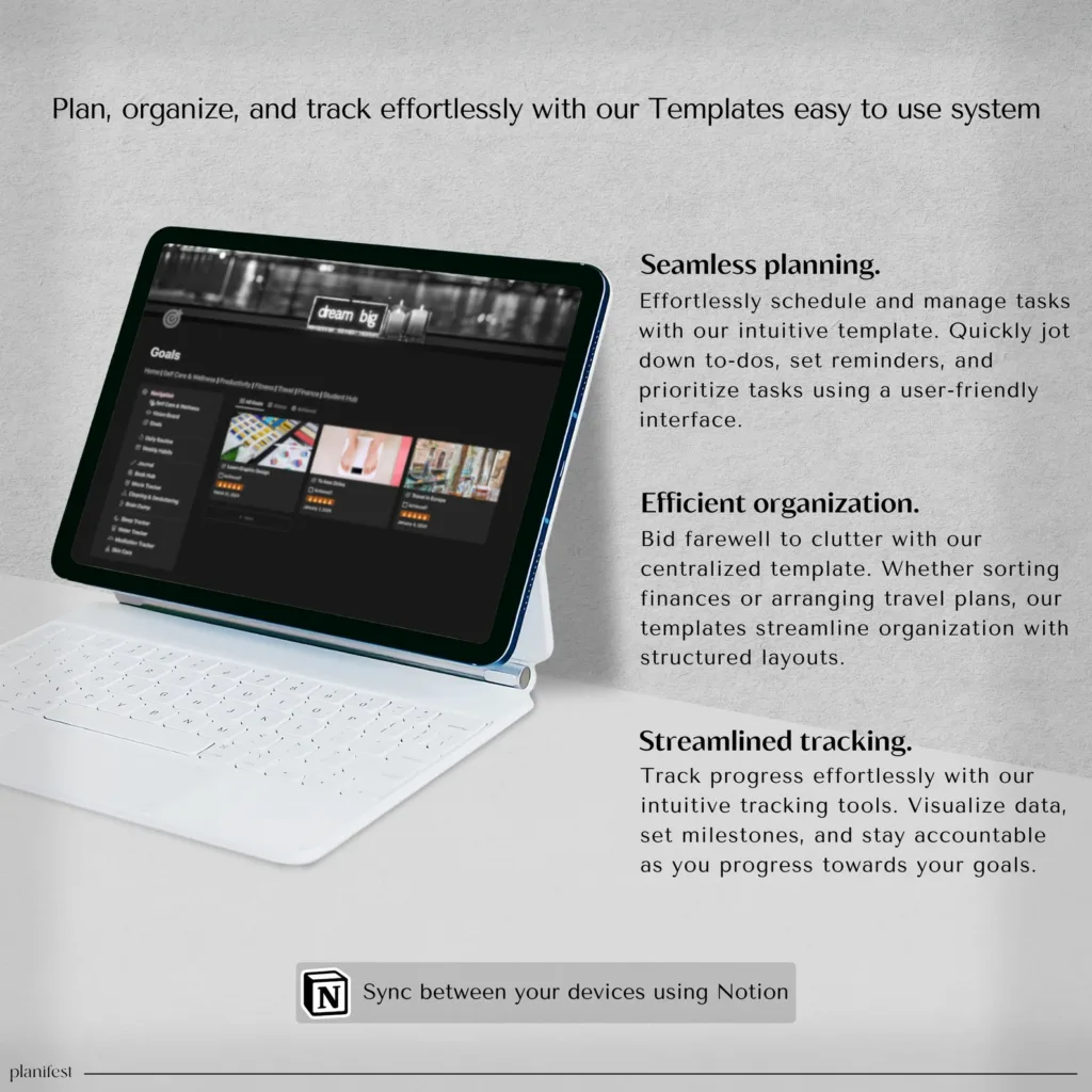 𝘚𝘪𝘮𝘱𝘭𝘪𝘧𝘺 𝘺𝘰𝘶𝘳 𝘭𝘪𝘧𝘦 𝘸𝘪𝘵𝘩 𝘰𝘶𝘳 𝘈𝘓𝘓-𝘐𝘕-𝘖𝘕𝘌 𝘕𝘖𝘛𝘐𝘖𝘕 𝘛𝘌𝘔𝘗𝘓𝘈𝘛𝘌 𝘧𝘰𝘳 𝘱𝘭𝘢𝘯𝘯𝘪𝘯𝘨, 𝘵𝘳𝘢𝘤𝘬𝘪𝘯𝘨, 𝘢𝘯𝘥 𝘰𝘳𝘨𝘢𝘯𝘪𝘻𝘪𝘯𝘨. 𝘚𝘦𝘢𝘮𝘭𝘦𝘴𝘴𝘭𝘺 𝘴𝘺𝘯𝘤 𝘺𝘰𝘶𝘳 𝘥𝘰𝘤𝘶𝘮𝘦𝘯𝘵𝘴 𝘢𝘤𝘳𝘰𝘴𝘴 𝘢𝘭𝘭 𝘥𝘦𝘷𝘪𝘤𝘦𝘴 𝘸𝘪𝘵𝘩 𝘵𝘩𝘦 𝘕𝘰𝘵𝘪𝘰𝘯 𝘈𝘱𝘱! 𝘌𝘯𝘫𝘰𝘺 𝘦𝘢𝘴𝘺 𝘳𝘦𝘢𝘥𝘢𝘣𝘪𝘭𝘪𝘵𝘺 𝘸𝘪𝘵𝘩 𝘰𝘶𝘳 𝘥𝘢𝘳𝘬 𝘮𝘰𝘥𝘦, 𝘥𝘦𝘴𝘪𝘨𝘯𝘦𝘥 𝘵𝘰 𝘣𝘦 𝘨𝘦𝘯𝘵𝘭𝘦 𝘰𝘯 𝘺𝘰𝘶𝘳 𝘦𝘺𝘦𝘴, 𝘰𝘳 𝘴𝘸𝘪𝘵𝘤𝘩 𝘵𝘰 𝘭𝘪𝘨𝘩𝘵 𝘮𝘰𝘥𝘦 𝘧𝘰𝘳 𝘢 𝘥𝘪𝘧𝘧𝘦𝘳𝘦𝘯𝘵 𝘷𝘪𝘣𝘦. 𝘞𝘪𝘵𝘩 6 𝘴𝘦𝘤𝘵𝘪𝘰𝘯𝘴 𝘢𝘯𝘥 𝘰𝘷𝘦𝘳 40 𝘵𝘦𝘮𝘱𝘭𝘢𝘵𝘦𝘴, 𝘪𝘵’𝘴 𝘺𝘰𝘶𝘳 𝘶𝘭𝘵𝘪𝘮𝘢𝘵𝘦 𝘴𝘰𝘭𝘶𝘵𝘪𝘰𝘯 𝘧𝘰𝘳 𝘴𝘵𝘳𝘦𝘢𝘮𝘭𝘪𝘯𝘪𝘯𝘨 𝘥𝘢𝘪𝘭𝘺 𝘳𝘰𝘶𝘵𝘪𝘯𝘦𝘴 𝘢𝘯𝘥 𝘦𝘯𝘩𝘢𝘯𝘤𝘪𝘯𝘨 𝘱𝘳𝘰𝘥𝘶𝘤𝘵𝘪𝘷𝘪𝘵𝘺. 𝘔𝘢𝘯𝘢𝘨𝘦 𝘴𝘦𝘭𝘧-𝘤𝘢𝘳𝘦 𝘢𝘯𝘥 𝘸𝘦𝘭𝘭𝘯𝘦𝘴𝘴, 𝘵𝘳𝘢𝘤𝘬 𝘧𝘪𝘯𝘢𝘯𝘤𝘦𝘴, 𝘴𝘦𝘵 𝘨𝘰𝘢𝘭𝘴, 𝘰𝘱𝘵𝘪𝘮𝘪𝘻𝘦 𝘧𝘪𝘵𝘯𝘦𝘴𝘴, 𝘱𝘭𝘢𝘯 𝘵𝘳𝘢𝘷𝘦𝘭, 𝘢𝘯𝘥 𝘴𝘵𝘢𝘺 𝘰𝘯 𝘵𝘰𝘱 𝘰𝘧 𝘴𝘤𝘩𝘰𝘰𝘭 𝘵𝘢𝘴𝘬𝘴—𝘢𝘭𝘭 𝘪𝘯 𝘰𝘯𝘦 𝘱𝘭𝘢𝘤𝘦.